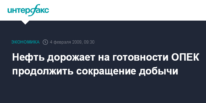 Москва. 4 февраля. INTERFAX.RU - Нефть дорожает на заявлении президента ОПЕК о готовности картеля продолжить сокращение добычи, если этого потребует ситуация на рынке, сообщило агентство Bloomberg.