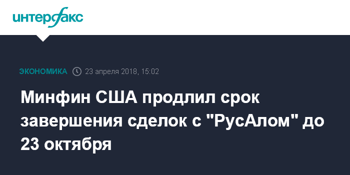 Москва. 23 апреля. INTERFAX.RU - OFAC (структура американского Минфина, отвечающая за правоприменение в области санкций) выдал лицензию, согласно которой операции с "РусАлом" должны быть завершены до 23 октября текущего года.