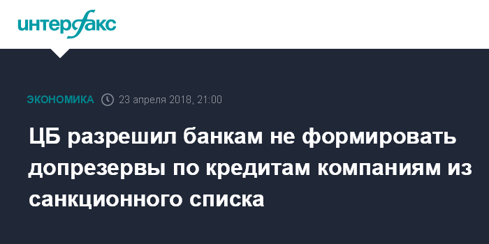 Москва. 23 апреля. INTERFAX.RU - ЦБ РФ дал российским банкам регуляторные послабления по резервам в отношении кредитов компаниям, которые в начале апреля вошли в "черный" список Минфина США, следует из информационного письма на сайте ЦБ.