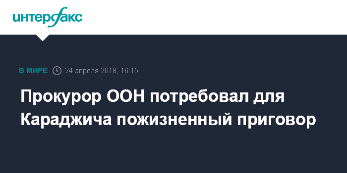 Москва. 24 апреля. INTERFAX.RU - Прокурор ООН Катрина Густафсон потребовала увеличить приговор бывшему лидеру боснийских сербов Радовану Караджичу с 40 лет до пожизненного срока, сообщает во вторник агентство Associated Press.