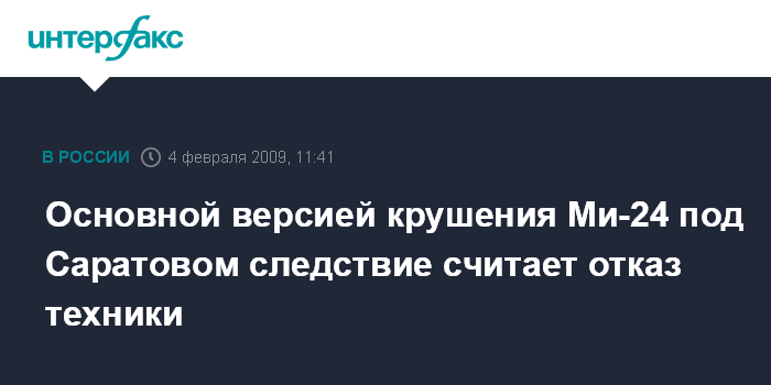 Москва. 4 февраля. INTERFAX.RU - Следствие на данный момент в качестве основной версии крушения вертолета Ми-24, произошедшего во вторник на аэродроме "Пугачев" (Саратовская область), рассматривает отказ техники.