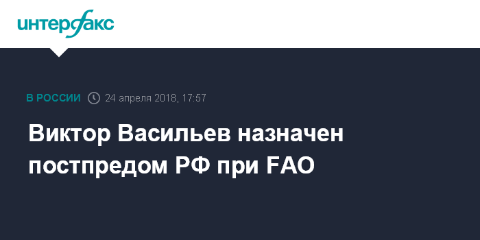Москва. 24 апреля. INTERFAX.RU - Президент РФ Владимир Путин назначил дипломата Виктора Васильева, ранее бывшего полпредом России при ОДКБ, постоянным представителем РФ при Продовольственной и сельскохозяйственной организации Объединенных Наций (FAO). Соответствующий указ опубликован на официальном портале правовой информации.