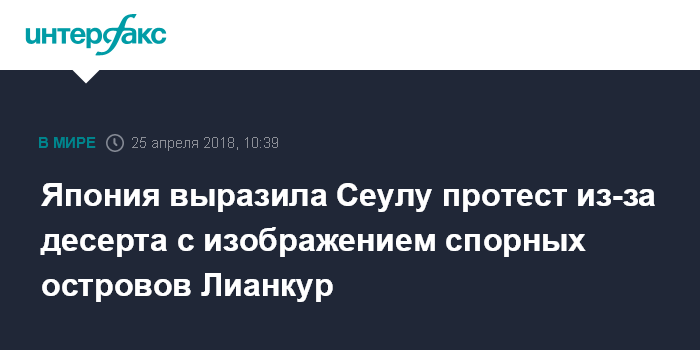 Москва. 25 апреля. INTERFAX.RU - Токио заявил протест Сеулу в связи с решением подать на межкорейском саммите десерт с изображением спорных островов Лианкур (японское название - Такэсима, корейское название - Токто), сообщает в среду агентство "Ренхап" со ссылкой на японские СМИ.