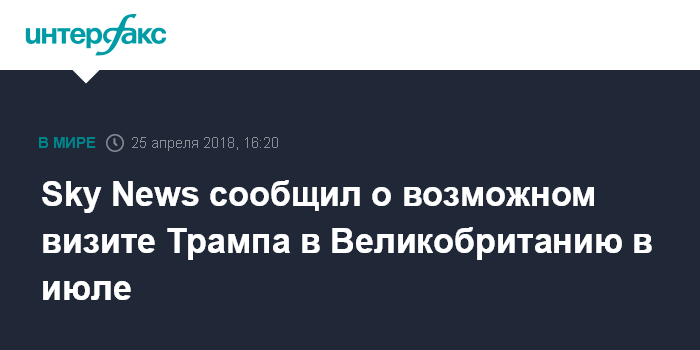 Москва. 25 апреля. INTERFAX.RU - Президент США Дональд Трамп посетит Великобританию в середине июля 2018 года, сообщает в среду телеканал Sky News со ссылкой на собственные источники.