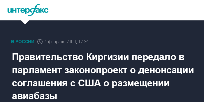 Москва. 4 февраля. INTERFAX.RU - Правительство Киргизии одобрило и передало в парламент проект закона о денонсации соглашения с США о размещении коалиционной авиабазы на территории республики.