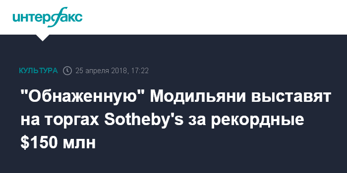 Москва. 25 апреля. INTERFAX.RU - Самая большая картина итальянского художника Амадео Модильяни "Обнаженная, лежащая на левом боку" будет выставлена на торгах аукционного дома Sotheby's в мае в Нью-Йорке с предварительной оценочной ценой более $150 млн, сообщили "Интерфаксу" в пресс-службе аукционного дома в среду.