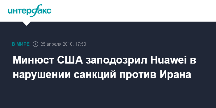 Москва. 25 апреля. INTERFAX.RU - Министерство юстиции США проводит расследование в связи с потенциальным нарушением китайской компанией Huawei американских санкций против Ирана, сообщили The Wall Street Journal информированные источники.