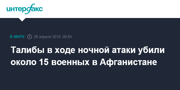 Москва. 26 апреля. INTERFAX.RU - Не менее 14 военнослужащих афганской национальной армии убиты и четверо ранены в ходе нападения боевиков радикального движения "Талибан" (запрещено в России) в приграничном с Таджикистаном уезде Дашти-Арчи провинции Кундуз, сообщили в четверг местные СМИ.