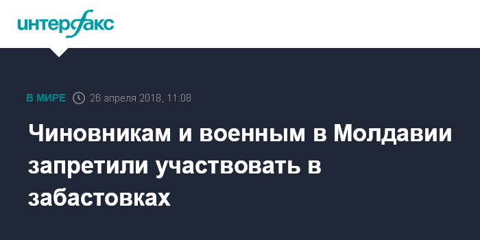 Москва. 26 апреля. INTERFAX.RU - Правительство Молдавии утвердило перечень предприятий и руководителей, которым запрещено участвовать в забастовках. Об этом сообщили "Интерфаксу" в пресс-службе кабинета министров.