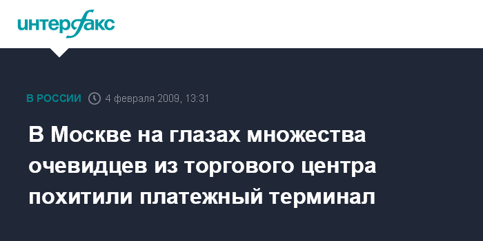 Москва. 4 февраля. INTERFAX.RU - Терминал по приему платежей похищен в среду днем из помещения торгового центра в Юго-Восточном округе Москвы, сообщил "Интерфаксу" источник в правоохранительных органах.