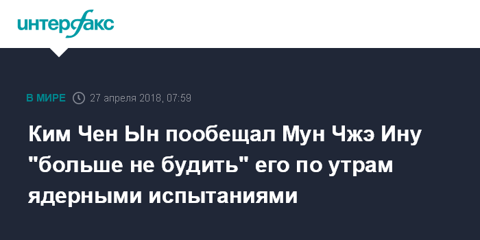 Москва. 27 апреля. INTERFAX.RU - Лидер КНДР Ким Чен Ын в ходе межкорейских переговоров на высшем уровне извинился перед президентом Южной Кореи Мун Чжэ Ином, что проведение Северной Кореей ядерного испытания в прошлом году вынудило южнокорейского руководителя проснуться ранним утром.