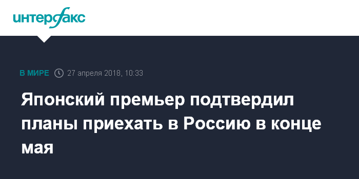 Москва. 27 апреля. INTERFAX.RU - Премьер-министр Японии Синдзо Абэ подтвердил намерение посетить Россию в конце мая.