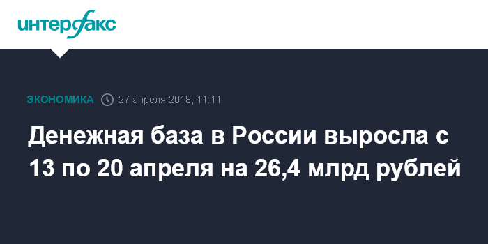 На 13 апреля денежная база в России равнялась 9841,9 млрд рублей. Таким образом, за период она выросла на 0,27%, или на 26,4 млрд рублей.