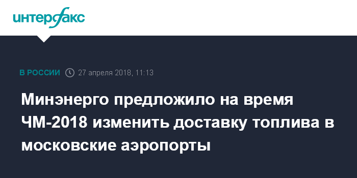 Москва. 27 апреля. INTERFAX.RU - Минэнерго предлагает на время проведения чемпионата мира по футболу перенаправить доставку топлива в московские аэропорты с железной дороги на трубопроводный транспорт, сообщили "Интерфаксу" в пресс-службе Минэнерго.