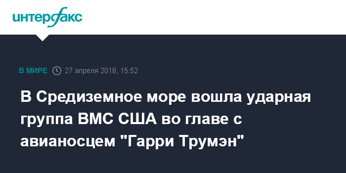 Москва. 27 апреля. INTERFAX.RU - Авианосная ударная группа ВМС США, возглавляемая атомным авианосцем "Гарри Трумэн" (USS Harry S. Truman (CVN 75)), в пятницу в районе 15:00 мск вошла в акваторию Средиземного моря, следует из данных системы международного мониторинга передвижения морских судов.