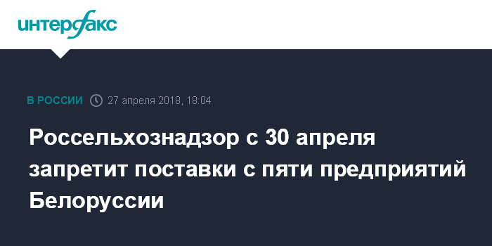 Москва. 27 апреля. INTERFAX.RU - Россельхознадзор с 30 апреля запрещает поставки продукции с пяти белорусских предприятий.