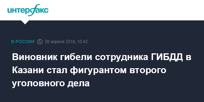 Москва. 28 апреля. INTERFAX.RU - Лихач, устроивший автоаварию в Казани, в которой один сотрудник Госавтоинспекции погиб, а другой получил травмы, стал фигурантом еще одного уголовного дела, сообщили агентству "Интерфакс" в пресс-службе следственного управления СКР по Татарстану.
