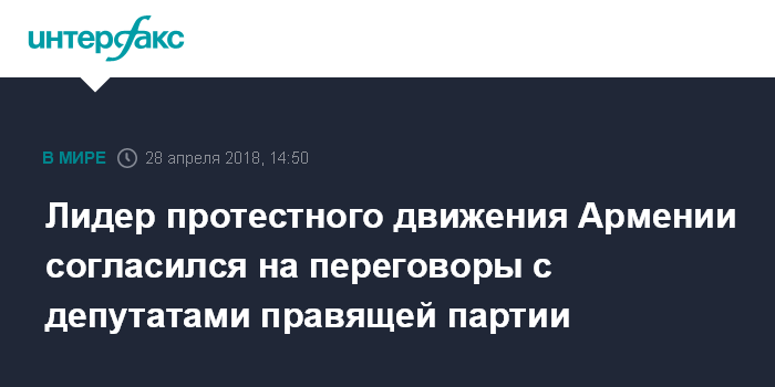 Москва. 28 апреля. INTERFAX.RU - Руководитель оппозиционной парламентской фракции "Елк", лидер протестного движения в Армении Никол Пашинян заявил о готовности к прямым переговорам с депутатами от правящей Республиканской партии.