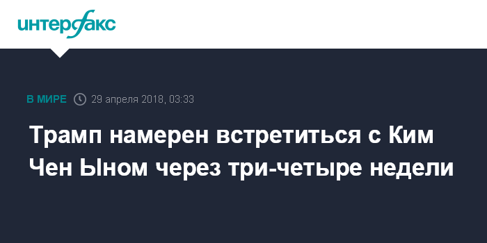 Москва. 29 апреля. INTERFAX.RU - Американо-северокорейский саммит может состояться через три-четыре недели, сообщил президент США Дональд Трамп.