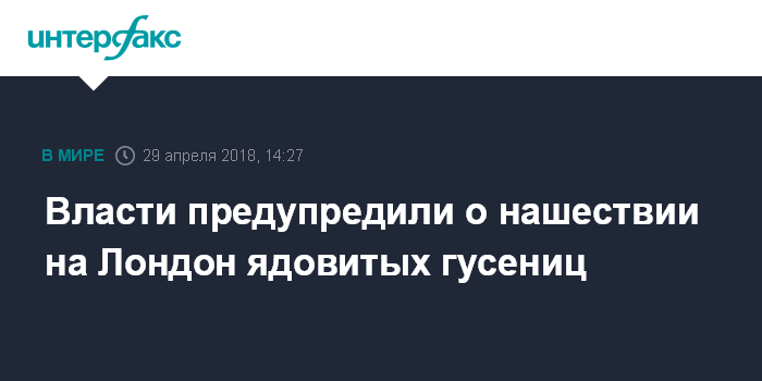 Москва. 29 апреля. INTERFAX.RU - Власти предупредили жителей Лондона о широком распространении ядовитых - "седых" - гусениц, контакт с которыми вызывает сыпь на теле, тошноту, рвоту и приступы астмы, сообщают в воскресенье местные СМИ.