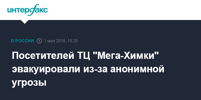 Москва. 1 мая. INTERFAX.RU - Более трех тысяч человек были эвакуированы из торгового центра "Мега-Химки" в Подмосковье из-за анонимного звонка об угрозе взрыва.