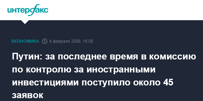 Москва. 4 февраля. INTERFAX.RU - В комиссию по контролю за осуществлением иностранных инвестиций, несмотря на последствия мирового финансового кризиса, в последнее время поступило порядка 45 заявок от зарубежных партнеров, сообщил премьер-министр РФ Владимир Путин.