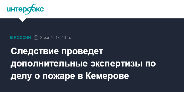 Москва. 3 мая. INTERFAX.RU - Следствие проведет дополнительные экспертизы по уголовному делу о гибели людей в пожаре в ТЦ "Зимняя вишня" в Кемерове, сообщила "Интерфаксу" в четверг официальный представитель Следственного комитета (СК) Светлана Петренко.