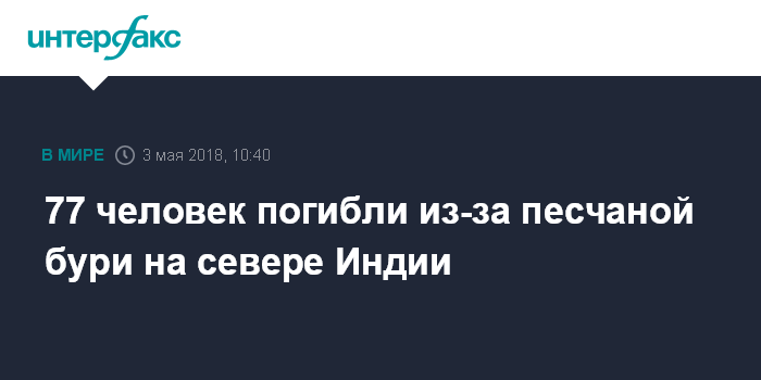 Москва. 3 мая. INTERFAX.RU - Не менее 77 человек стали жертвами песчаной бури в северных районах Индии, сообщает в четверг телеканал Sky News.