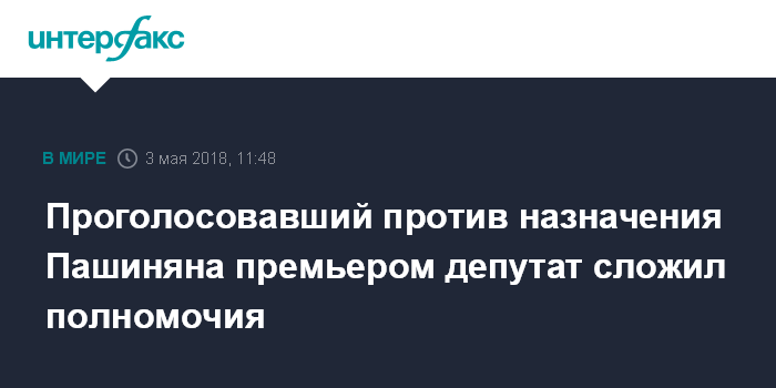 Проголосовавший против назначения Пашиняна премьером депутат сложил полномочия