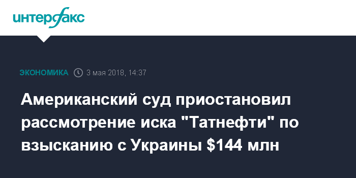 Москва. 3 мая. INTERFAX.RU - Суд Вашингтона, округ Колумбия, (США) приостановил рассмотрение иска "Татнефти" (РФ) по признанию и выполнению на территории США взыскания с Украины $144 млн до решения вопроса юрисдикции.