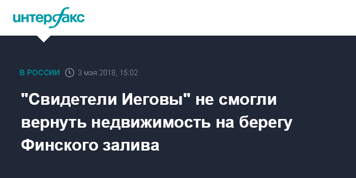 Москва. 3 мая. INTERFAX.RU - Санкт-Петербургский городской суд отклонил апелляционную жалобу российского юридического лица "Свидетелей Иеговы" на судебное решение об отчуждении в пользу РФ у общины собственности на берегу Финского залива в Курортном районе северной столицы.