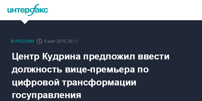Москва. 4 мая. INTERFAX.RU - Центр стратегических разработок, возглавляемый экс-министром финансов РФ Алексеем Кудриным, предложил создать платформу для цифровой трансформации госуправления с куратором в должности отдельного вице-премьера и бюджетом, выделяющимся сейчас на автоматизацию органов власти.