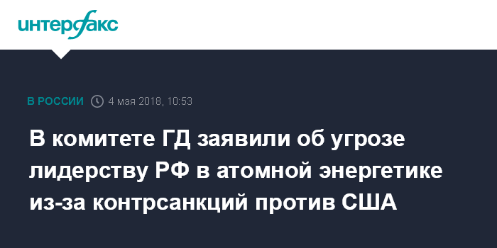 Москва. 4 мая. INTERFAX.RU - Отдельные нормы законопроекта о санкциях против США и других стран могут привести к потере Россией лидирующих позиций на рынке атомной энергетики, считают в комитете по энергетике Госдумы.