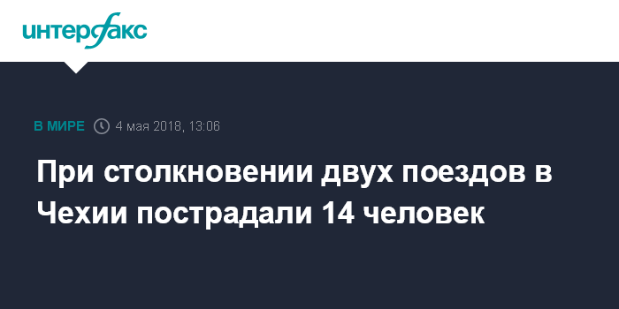"Два пассажирских поезда столкнулись в деревне Мршич в Чески-Крумлове. Ранения получили 14 человек, четыре из них имеют травмы средней тяжести, среди пострадавших также трое детей. Предположительно причиной аварии стала ошибка одного из машинистов, который проехал по одноколейной дороге там, где это было запрещено", - пишет газета.