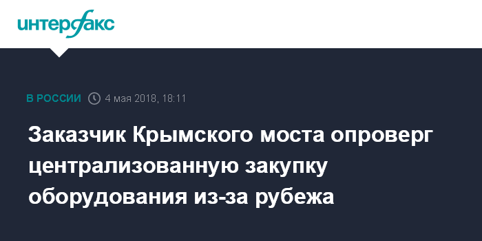 Москва. 4 мая. INTERFAX.RU - Подрядчики строительства моста через Керченский пролив используют для работ множество видов спецтехники, в том числе произведенной за пределами России, но централизованной закупки/поставки иностранного оборудования под возведение транспортного перехода не было.