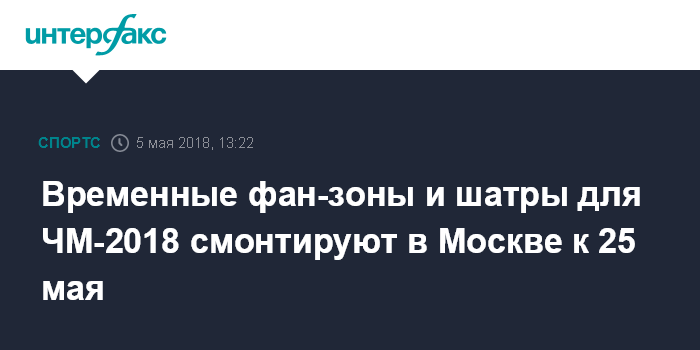 Москва. 5 мая. INTERFAX.RU - Монтаж временных шатров, фан-зон и складов, необходимых для проведения чемпионата мира по футболу, будет завершен в Москве к 25 мая, заявил заместитель мэра столицы по вопросам градостроительной политики и строительства Марат Хуснуллин.