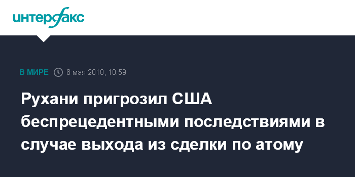 Москва. 6 мая. INTERFAX.RU - Президент Ирана Хасан Рухани в воскресенье предупредил, что США столкнутся с серьезнейшими последствиями, если решат выйти из соглашения по атому, заключенного "шестеркой" международных посредников с Тегераном.