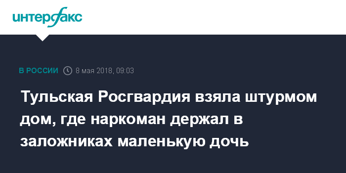 Москва. 8 мая. INTERFAX.RU - В Тульской области возбуждено уголовное дело по факту захвата ребенка в заложники собственным отцом, который был обезврежен после штурма дома сотрудниками Росгвардии, сообщила "Интерфаксу" представитель СУ СКР по региону Зинаида Каминская.