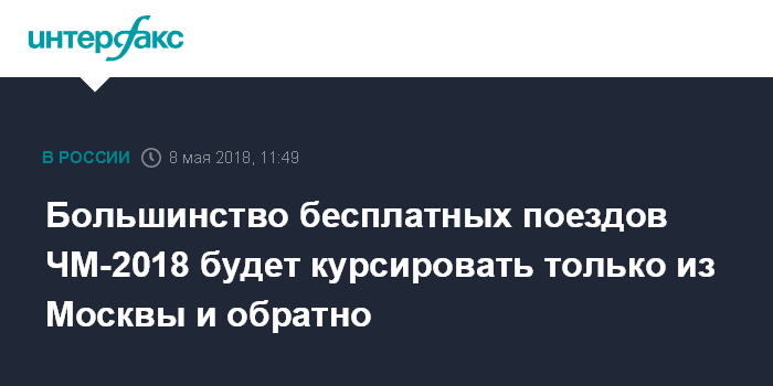 Москва. 8 мая. INTERFAX.RU - Большинство бесплатных поездов в период Чемпионата мира по футболу будет курсировать из Москвы в города-участники и обратно, говорится в письме генерального директора транспортной дирекции чемпионата мира по футболу 2018 года в РФ Кирилла Полякова в ответ на обращение болельщиков из Петербурга.