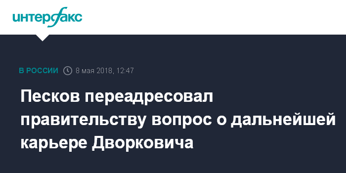 Москва. 8 мая. INTERFAX.RU - Пресс-секретарь главы государства Дмитрий Песков переадресовал правительству вопрос о дальнейшей судьбе исполняющего обязанности вице-премьера Аркадия Дворковича, чье имя не было названо накануне исполняющим обязанности премьера Дмитрием Медведевым в качестве кандидата в новый состав кабинета министров.