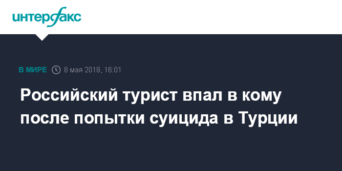 Москва. 8 мая. INTERFAX.RU - Турист из Екатеринбурга впал в кому после попытки суицида на курорте в турецкой Аланье, сообщили "Интерфаксу" во вторник в пресс-службе страховой компании ERV.