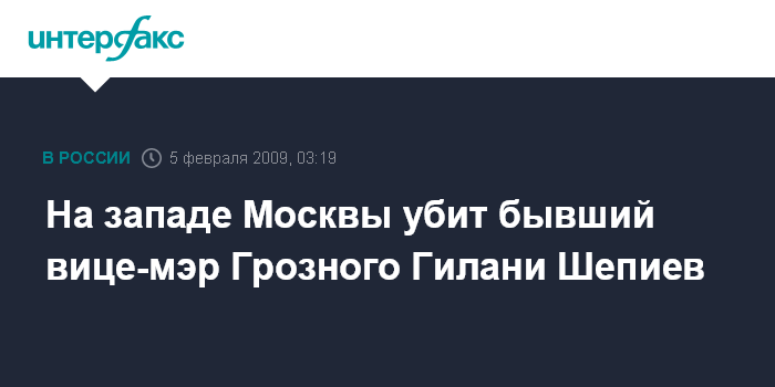Москва. 5 февраля. ИНТЕРФАКС-МОСКВА - В столице совершено убийство бывшего вице-мэра чеченского города Грозный Гилани Шепиева, сообщил "Интерфаксу" источник в правоохранительных органах Москвы.