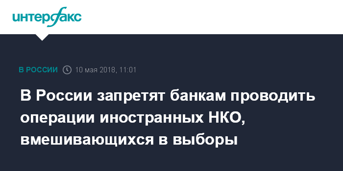 Москва. 10 мая. INTERFAX.RU - Законопроект о распространении "закона Димы Яковлева" на некоммерческие организации, которые вмешиваются в выборы в РФ, определяет, что банки будут обязаны отказывать в проведении операций иностранным неправительственным организациям, которые вмешиваются в выборы в России.