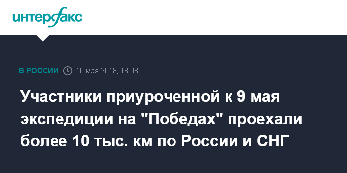 Москва. 10 мая. INTERFAX.RU - Участники медиаэкспедиции "Победа - одна на всех", проходившей на раритетных автомобилях ГАЗ М-20 "Победа" с 17 апреля по 9 мая, посетили более 50 городов и населенных пунктов России и трех стран СНГ и проехали более 10 тысяч км.