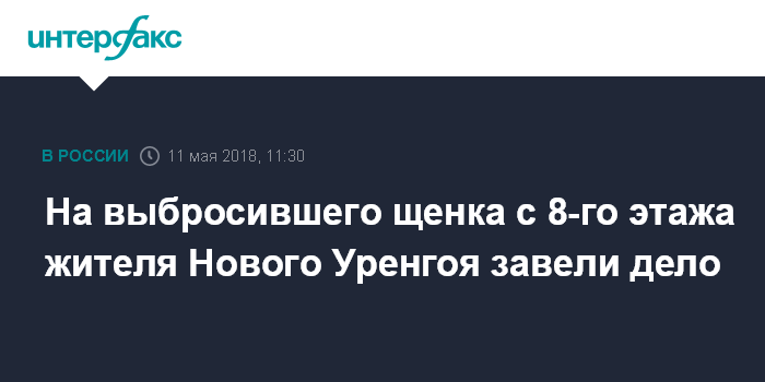 Москва. 11 мая. INTERFAX.RU - Полиция в Новом Уренгое возбудила уголовное дело на местного жителя, выбросившего из окна многоэтажки щенка.