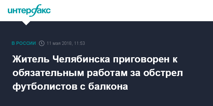 Москва. 11 мая. INTERFAX.RU - Суд в Челябинске приговорил к обязательным работам местного жителя, обстрелявшего с балкона взрослых и подростков, игравших в футбол на дворовой спортплощадке, сообщила агентству "Интерфакс" пресс-секретарь областной прокуратуры Наталья Мамаева в пятницу.