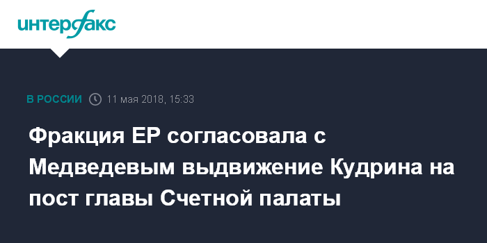 Накануне первый замруководителя фракции "Единая Россия" Андрей Исаев сообщил "Интерфаксу", что Кудрин, как ожидается, будет предложен фракцией на пост председателя Счетной палаты. Соответствующее предложение от парламентского большинства ему уже поступило. По словам Исаева, парламентское большинство видит в Кудрине "квалифицированного оппонента, выступающего с конструктивных позиций".