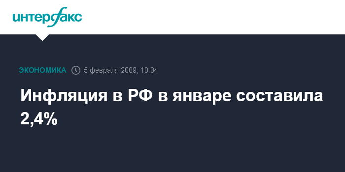 Москва. 5 февраля. INTERFAX.RU - Инфляция в РФ в январе 2009 г. составила 2,4% по сравнению с 2,3% в январе 2008 года, сообщила в четверг Федеральная служба государственной статистики (Росстат).