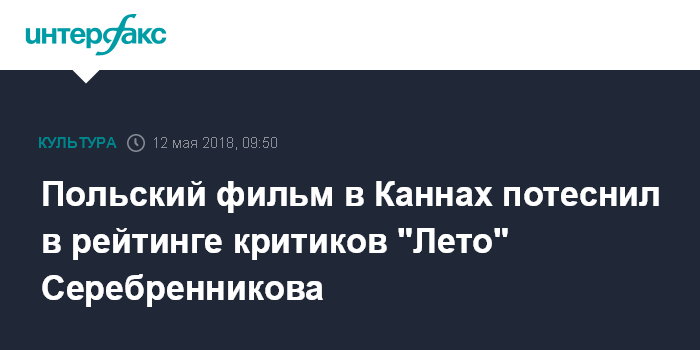 Москва. 12 мая. INTERFAX.RU - Польский фильм "Холодная война" Павла Павликовского сместил картину "Лето" Кирилла Серебренникова с первого места рейтинга кинокритиков в Каннах, сообщается в журнале Screen. К субботе на Каннском кинофестивале показали шесть фильмов основного конкурса, у пяти есть оценки критиков.