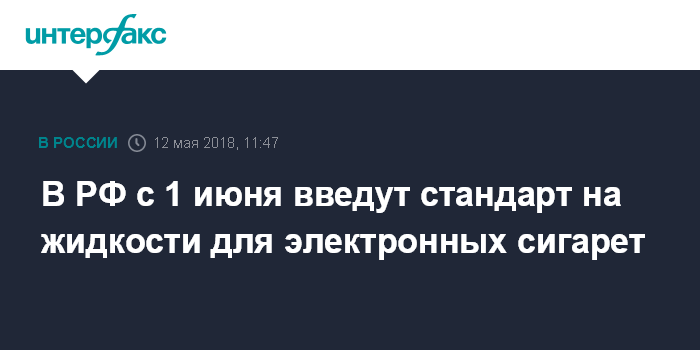 Москва. 12 мая. INTERFAX.RU - В России с 1 июня 2018 года вводится стандарт на жидкости для электронных систем доставки никотина (ЭСДН).